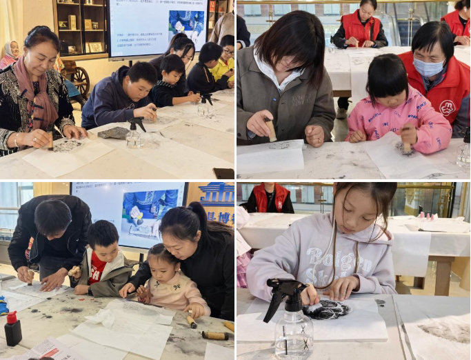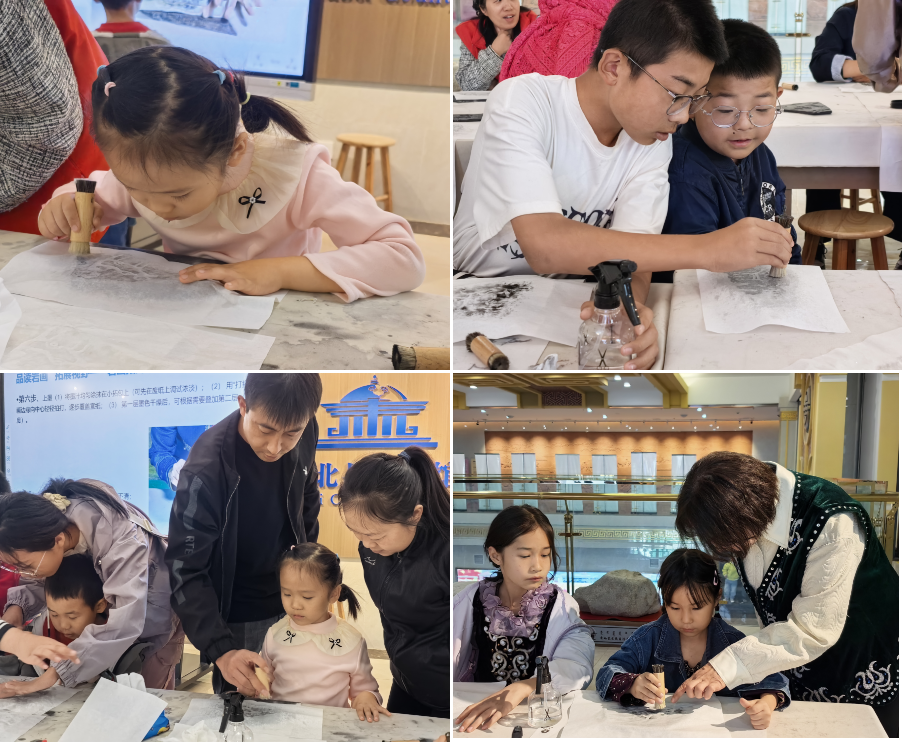 最受期待的实践环节中,工作人员首先完整演示了岩画拓片的操作流程:从宣纸裁剪的尺寸把控,到喷水浸润的湿度掌握,再到拓包蘸墨的轻重力度,每一个细节都讲解得细致入微。“宣纸要紧紧贴住岩画复刻版,不能留气泡,不然拓出来的线条会断哦!”“蘸墨的时候要轻,像给拓包‘轻轻扑粉’一样,这样图案才清晰。” 在工作人员的耐心指导下,家长与孩子分工协作,默契配合:有的家庭由家长固定宣纸,孩子手持小拓包小心翼翼地捶打;有的家庭则互相交换角色,体验不同步骤的乐趣。过程中,孩子们专注的眼神、认真的模样格外动人,家长们也放下手机,全身心投入,与孩子一同解决操作中遇到的小问题。当一幅幅带着墨香、线条分明的岩画拓片从手中诞生时,每个家庭都充满了成就感,现场不时响起惊喜的欢呼。